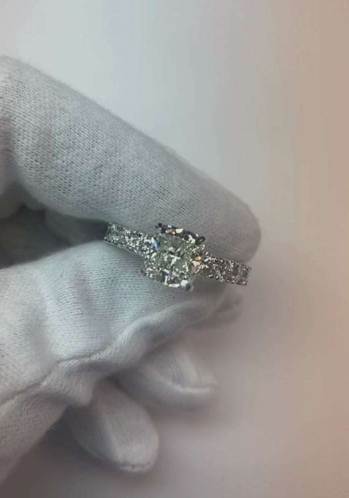 rotondi: c'è un diamante cuscino di ca. 3 carati (dimensioni ca. 7.6 x 7.4 mm) e piccoli diamanti rotondi ca. 3 carati. Diamanti estratti da terra naturale.