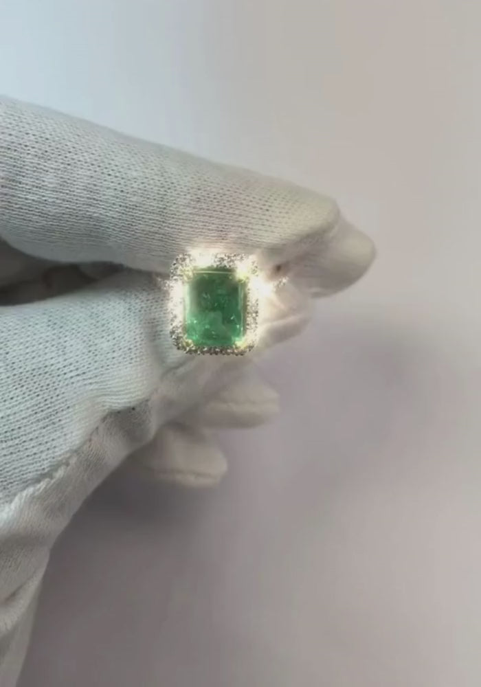 Dettagli della pietra: ce n'è uno a forma di smeraldo verde smeraldo al centro di mq. 3 carati (circa 10,2 x 7,4 mm) e ca. 0,55 carati di diamanti più piccoli sul gambo. Pietre naturali estratte dalla terra.