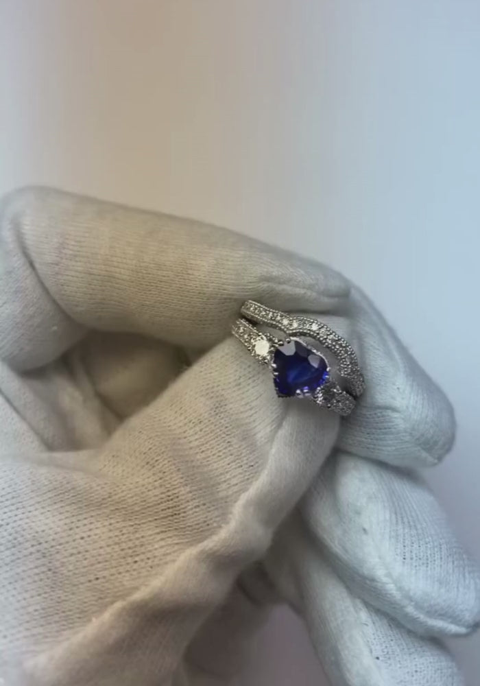 anello di fidanzamento vecchio stile 3,50 carati cuore zaffiro blu e diamante