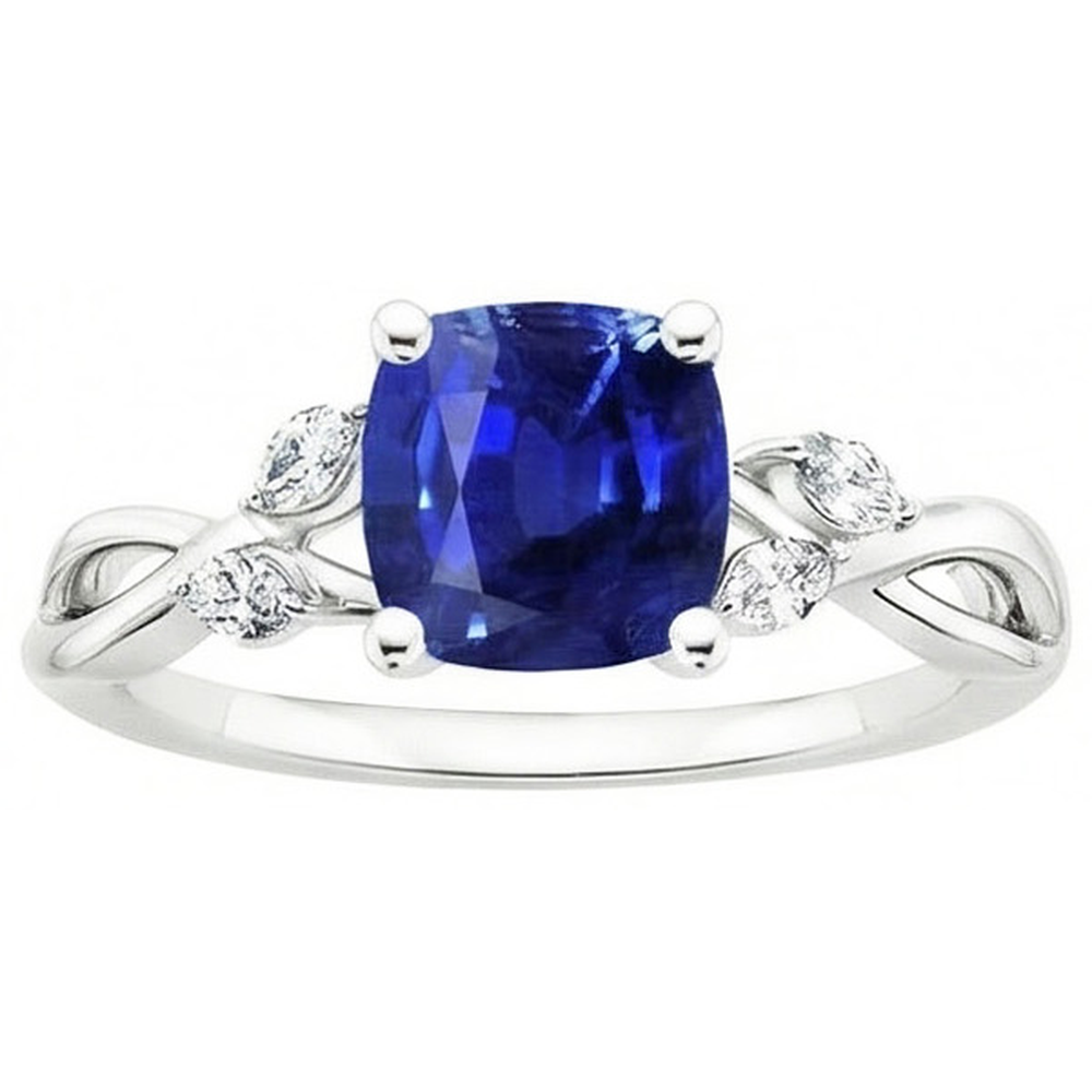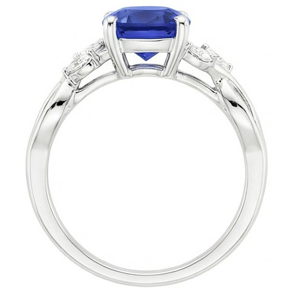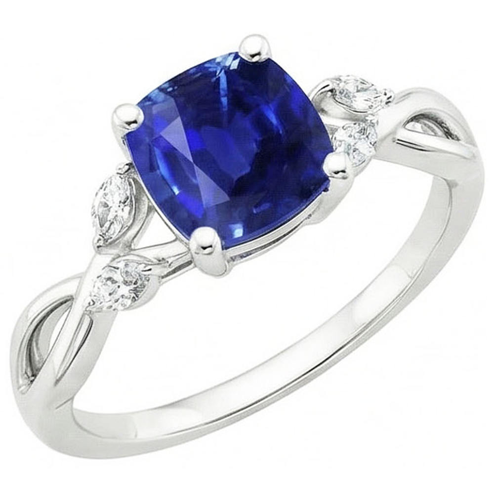 Dettagli in pietra: c'è un cuscino zaffiro ca. 1,50 carati (dimensioni ca. 7,5 x 5,5 mm) e ca. 0,60 carati di diamanti più piccoli ai lati. Pietre estratte dalla terra naturale.