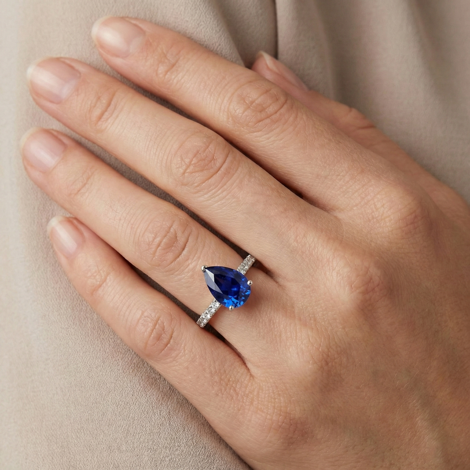 Dettagli pietra: è presente un taglio a pera zaffiro ca. 2,50 carati (circa 10 x 6 mm) e ca. 1,50 carati di diamanti sui lati. Pietre naturali estratte dalla terra.
