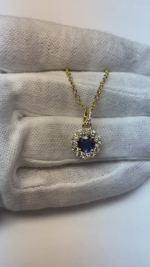 Collana con pendente in zaffiro blu rotondo da 2 carati e diamanti in oro 14K