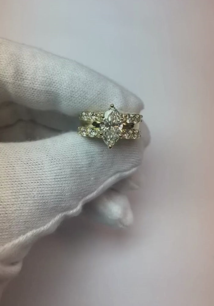 Dettagli in pietra: questo nuovo scintillante anello di diamanti presenta un diamante a taglio marquise al centro di ca. 2 carati (dimensioni ca. 11,7 x 5,7 mm) e ca. 2 carati di diamanti tondi ai lati. Diamanti estratti da terre naturali.