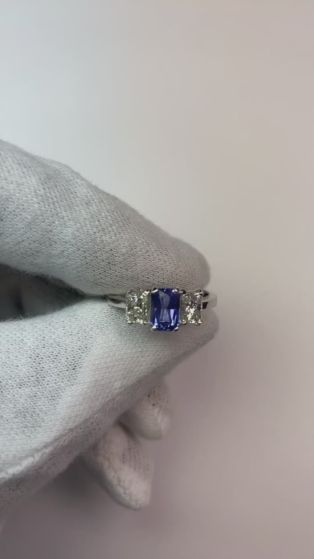 Dettagli pietra: c'è un taglio smeraldo zaffiro ca. 1,50 carati (dimensioni circa 7 x 6 mm) e due diamanti radianti ca. 0,75 carati ciascuno (dimensioni circa 5,7 x 3,7 mm) sui lati. Pietre naturali estratte da terra.