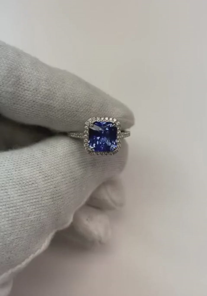 Dettagli in pietra: c'è uno zaffiro a taglio radiante di ca. 3,50 carati (circa 9 x 7 mm) e ca. 1,50 carati di diamanti sui lati. Pietre naturali estratte dalla terra.
